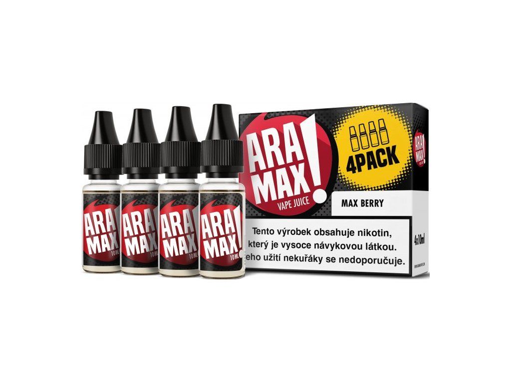 MAX BERRY - Aramax 4pack 4x10ml - výrobce zaručuje skvělý projev v jakémkoliv modelu e-cigarety. Pokud tak hledáte cenově dostupnou náplň do své e-cigarety, jsou e-liquidy Aramax skvělou volbou.